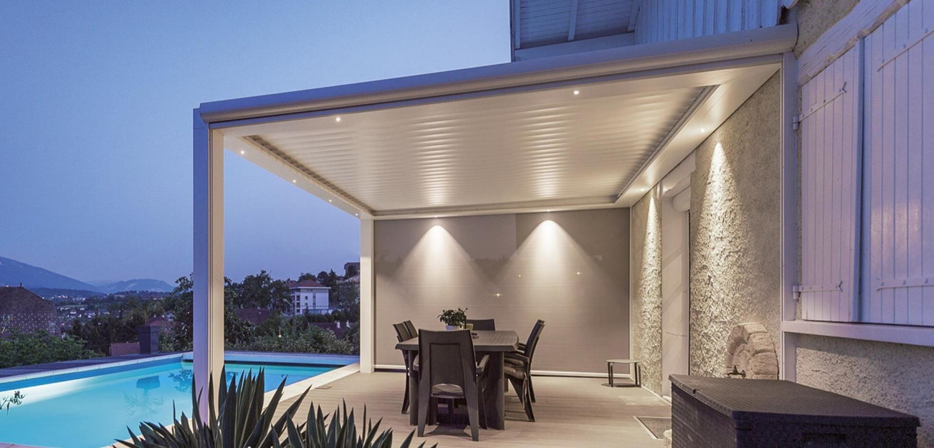 Côté pergolas, notre expertise couvre la pergola bioclimatique à lames orientables, à toiture fixe, avec toile rétractable, panneaux vitrés ou plats.